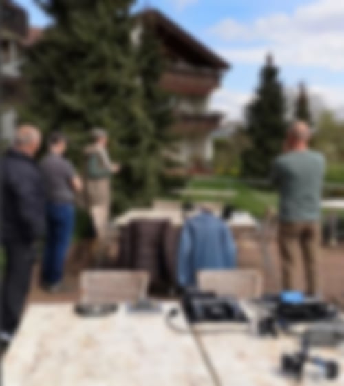 Auf der Terasse des Landhotel folgte, bei doch sehr kühlen Temperaturen, der praktische Teil mit einer kurzen Einweisung zur Drohne. Uwe erläuterte, wie eine Drohne bedient wird und auf was es beim Drohnenflug ankommt. Rudi übernahm den Part mit dem Wärmebildmonitor. Es wurde eine Flugroute geladen und abgeflogen. Und tatsächlich wurden 2 Rehkitze in der Wiese entdeckt. Rehkitze zu dieser Zeit? Natürlich nicht, wir hatten 2 Wärmeflaschen versteckt :-)