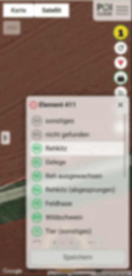 Bei den Läufern handelt es sich um die eigentlichen Mitarbeiter, die die gefundenen Rehkitze sichern. Die Läufer sind mit ihren Handys ebenfalls mit der POICloud verbunden. Ein paar Sekunden nachdem der Pilot einen Marker gesetzt hat, erscheint dieser auch auf den Handys der Läufer als roter Kreis mit der Bezeichnung „ELEMENT“. Der Läufer klickt den roten Kreis an und startet die Navigation (Bild 2). Ein kleiner Kompass im unteren Bildbereich des Handys zeigt dem Läufer, hier 'UG', die Entfernung und die Richtung bis zum Marker. Der Läufer setzt sich in Bewegung. Er kann sich bis fast auf einen halben Meter genau zum Marker navigieren lassen. Hat der Läufer den Marker erreicht und ein Rehkitz gefunden, bringt er es an den Wiesenrand und sichert es entsprechend mit einem Korb oder einer Kiste, die mit Erdspießen ausgerüstet ist, gegen Weglaufen. Danach klickt er diesen Marker auf seinem Handy an und wählt aus einer Liste aus, um welches Element es sich handelt. Für das gefundene Rehkitz klickt er 'RK' an und speichert den Eintrag (Bild 3). Danach geht der Läufer zum nächsten Marker.
